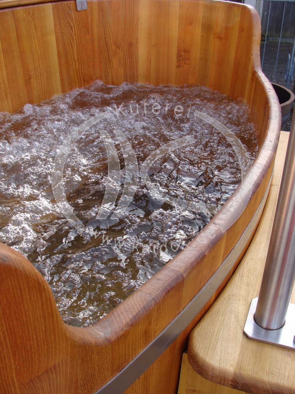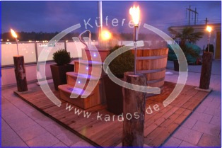 Our hot tubs are made of acacia (robinia). They are available in different sizes for 2 - 10 people. They are equipped with our patented below the bench stainles steel oven inc. seperation, chimney pipe incl. protection, drain with rubber plug, fixed mounted seats, ladder or stairscase and beverage tray(s). Optionally we offer a cartridge filter or sand filter system and covers.